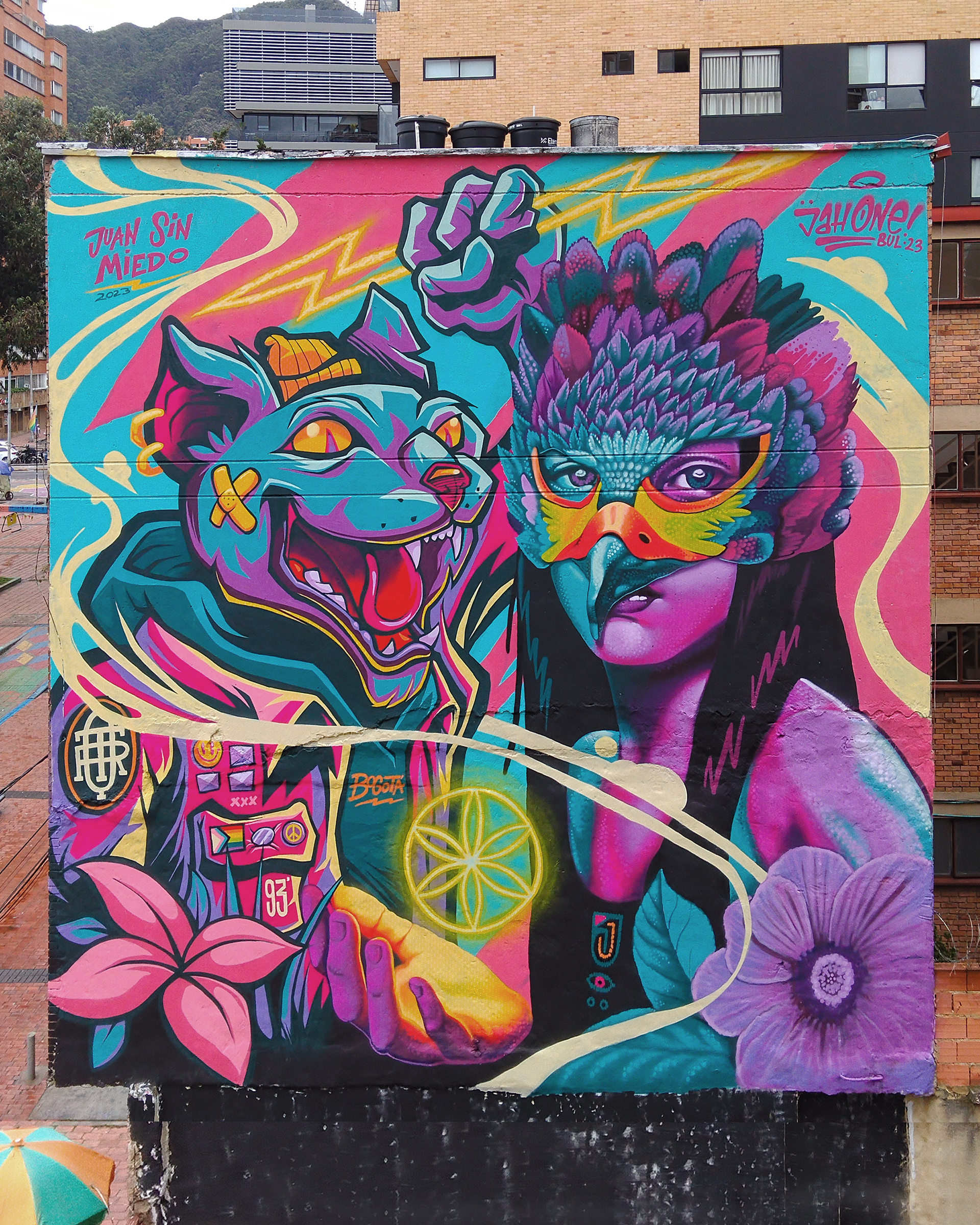 Collaboration wall between Juan sin Miedo and JahOne in Bogota, Colombia. Organized by TraqueCo